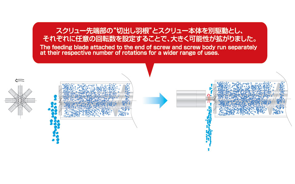 - 独自のスクリュ構造+切出し羽根でベルトコンベア等へも均一供給